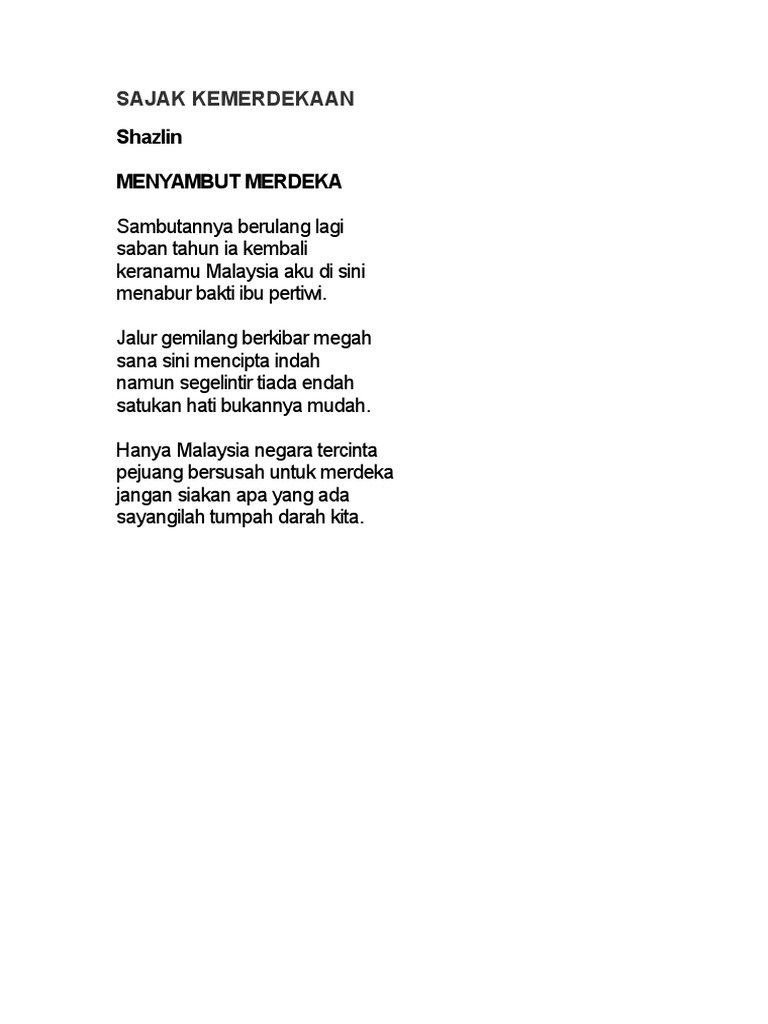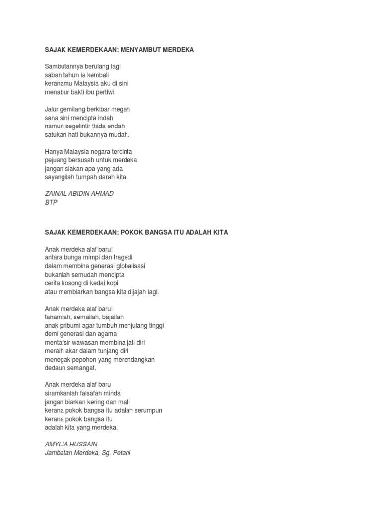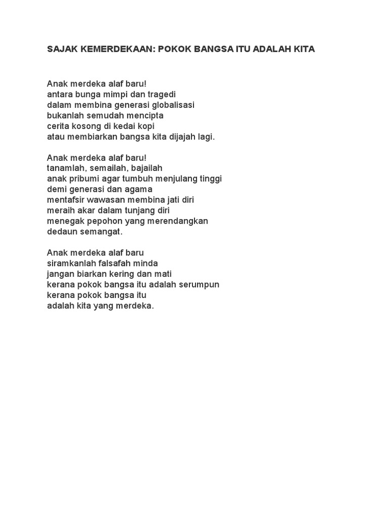 Click to share on Facebook Opens in new. Negara Anugerah ilahi Rabbi. SAJAK KEMERDEKAAN DEMI NEGARA Aku anak merdeka Lahirku disini Berdiri megah di pentas wira Inginku menentang penjajah Menentang musuh demi Malaysia Aku sanggup berkorban masa Walaupun musuh yang datang Aku tak kan berundur walaupun selangkah kebelakang Aku anak merdeka Bangkit daripada peperangan.
